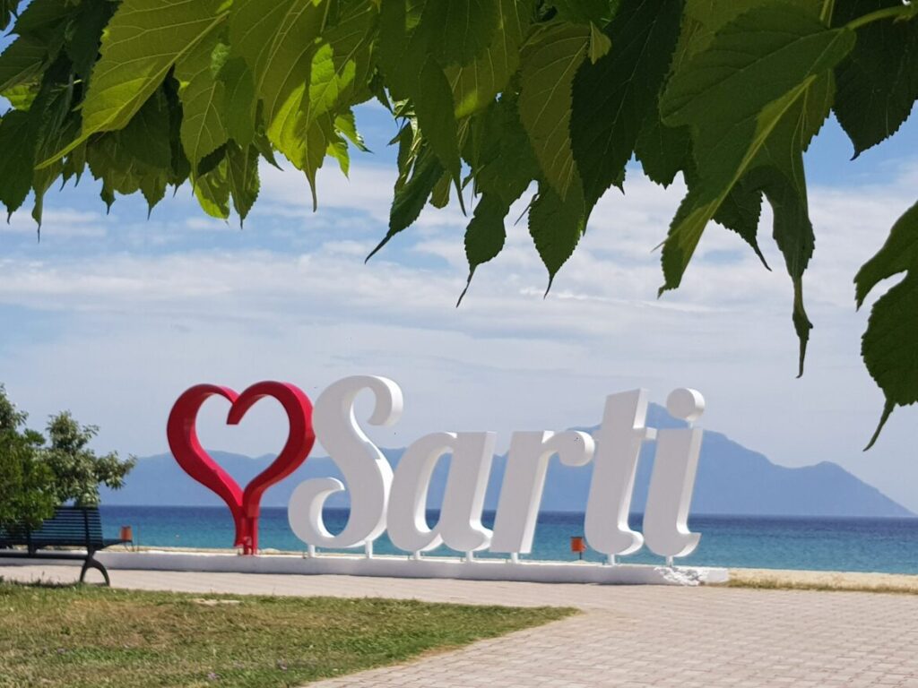 The picturesque Sarti beach, honored with the Blue Flag, stands out as a favored tourist hotspot. Stretching over 2.8 km, it’s one of the longest in the region. The pristine white sands and the turquoise waters of Sarti add a distinctive charm to the pine-clad peninsula.