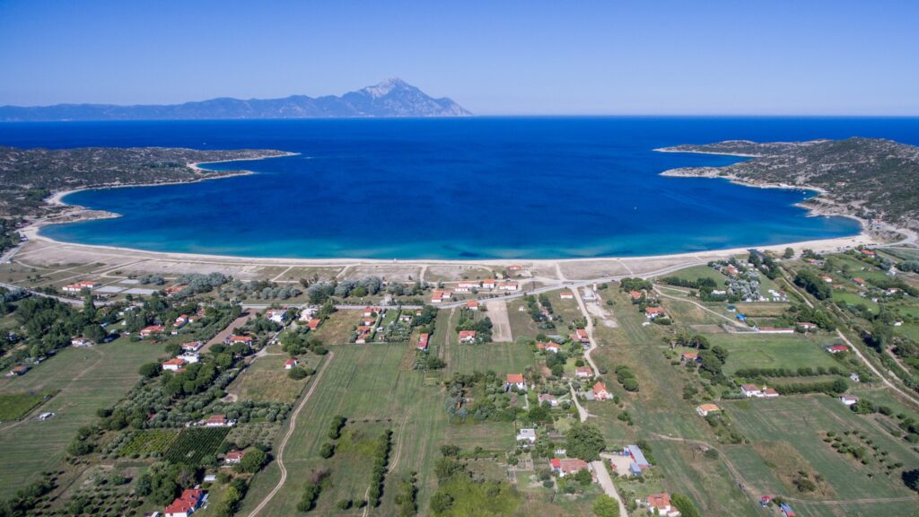 Flanked by mountainous terrain on either side, it’s reminiscent of a corridor opening up to the vast sea. Its golden sands meet the sea, forming one of Sithonia’s most stunning landscapes.
